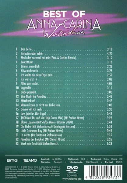 01. Woitschack, Anna-Carina "Das Beste" 02. Woitschack, Anna-Carina "Verboten aber sch?n" 03. Woitschack, Anna-Carina "Mach das nochmal mit mir (Zero & DeNiro Remix)" 04. Woitschack, Anna-Carina "Leuchtturm" 05. Woitschack, Anna-Carina "Einmal unendlich" 06. Woitschack, Anna-Carina "Küss mich wach" 07. Woitschack, Anna-Carina "Ich wollte nie dein Engel sein" 08. Woitschack, Anna-Carina "Ich war erst 17" 09. Woitschack, Anna-Carina "Alles oder nichts" 10. Woitschack, Anna-Carina "Legend?r" 11. Woitschack, Anna-Carina "Liebe passiert" 12. Woitschack, Anna-Carina "Eine Nacht im Paradies" 13. Woitschack, Anna-Carina "M?rchenbuch" 14. Woitschack, Anna-Carina "Warum kann es nicht nur Liebe sein" 15. Woitschack, Anna-Carina "Davon will ich mehr" 16. Woitschack, Anna-Carina "Lass jetzt los (Let it go)" 17. Woitschack, Anna-Carina / Mross, Stefan "1000 Mal Du und ich" 18. Woitschack, Anna-Carina / Mross, Stefan "Blaue Lagune" 19. Woitschack, Anna-Carina / Mross, Stefan "Die Liebe" 20. Woitschack, Anna-Carina / Mross, Stefan "Little drummer boy" 21. Woitschack, Anna-Carina / Mross, Stefan "Lo siento" 22. Woitschack, Anna-Carina / Mross, Stefan "Paradies der Ewigkeit" 23. Woitschack, Anna-Carina / Mross, Stefan "Stark wie zwei"