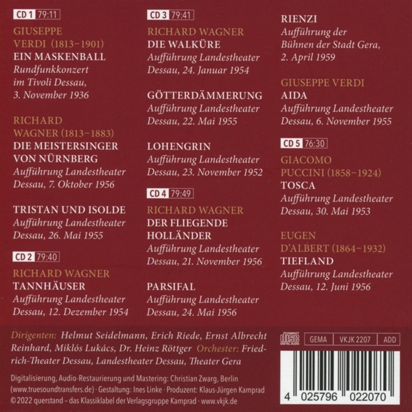 Disc 01 Un ballo in maschera (Ein Maskenball, Oper in 3 Akten) (Auszug) 01. Wolf, Horst "Wohl kam im sich'ren Hause l?ngst sie zur Ruh'" Die Meistersinger von Nürnberg (Oper in 3 Akten) (Auszug) 02. Steudel, Hans "Am stillen Herd in Winterszeit" 03. Steudel, Hans "Für Dich, Geliebte, sei's getan! ... Fanget an!" 04. Steudel, Hans "Ja, Ihr seid es! Nein, du bist es!" 05. Steudel, Hans "Grüß Gott, mein Junker! Ruhet Ihr noch?" 06. Steudel, Hans "Morgenlich leuchtend in rosigem Schein" 07. Steudel, Hans "Abendlich glühend in himmlischer Pracht" 08. Steudel, Hans "H?rte heut' gar ein sch?nes Lied ... Weilten die Sterne" Tristan und Isolde (Oper in 3 Akten) (Querschnitt) 09. Uhlig, Kurt "Kurwenal! He! Sag, Kurwenal!" 10. Uhlig, Kurt "Die alte Weise - Was weckt sie mich?" 11. Uhlig, Kurt "Dünkt dich das? Ich weiß es anders" 12. Uhlig, Kurt "Der einst ich trotzt', aus Treu zu dir" 13. Uhlig, Kurt "Noch ist kein Schiff zu sehn!" 14. Uhlig, Kurt "Mein Herre! Tristan! Schrecklicher Zauber!" 15. Uhlig, Kurt "O Wonne! Freude! Ha! Das Schiff!" 16. Uhlig, Kurt "O diese Sonne! Ha, dieser Tag!"