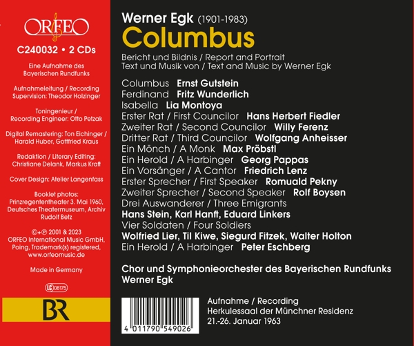 Beschreibung:?Columbus - An Opera for Listening By the term "radio opera", people understood, above all, the adaptation of stage works for radio. The first attempts were carried out in Berlin and soon commissions were offered for original works in the medium. General comprehensibility was the most important principle and the listener was supposed to have an exciting listening experience with the help of modern technical means. Werner Egk, too, although still lacking in dramatic musical experience, sensed the fascination emanating from this avant-garde genre. His chief model here was Igor Stravinsky's Oedipus Rex. The booklet contains liner notes and synopsis in German and English language and the German libretto., Runningtime: 00:00:00, Labelcode OEO2432.2