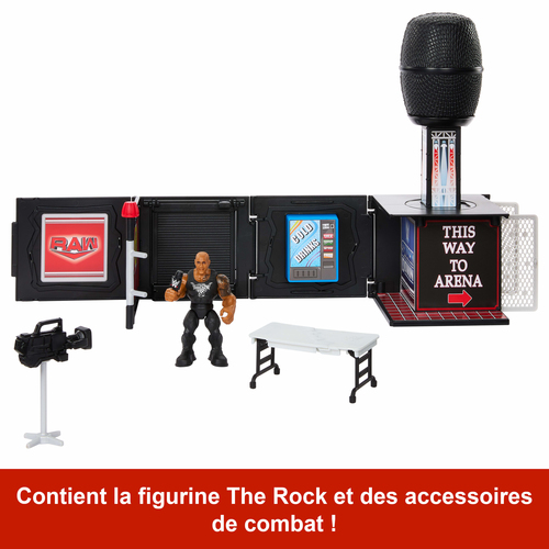In der Anwendung ist das Playset ideal für fantasievolles Rollenspiel: Kinder können Interviews mit WWE-Superstars nachstellen, eigene Promos "am Mikro" erfinden oder ihre Actionfiguren-Matches mit Live-Kommentar begleiten. Es ergänzt bestehende WWE-Ringe oder Arenen, indem es den Show-Aspekt - Sprüche, Ankündigungen und Publikumsansprache - in das Spiel integriert. Darüber hinaus eignet sich das Mikrofon als witziges Accessoire für Mottopartys, Kostüme oder für junge Fans, die The Rocks typische Art und Ausstrahlung nachempfinden wollen.