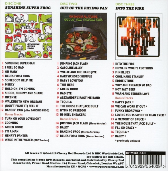 Disc 01 01. "Sunshine Superman" 02. "I feel so bad" 03. "Oh Mary" 04. "Blues for a frog" 05. "Somebody help me" 06. "Mercy" 07. "Hold on, I'm coming" 08. "Shook, shimmy and shake" 09. "Incense" 10. "Walking to New Orleans" 11. "(Don't fight it) Feel it" 12. "Dancin' pain (Dancing frog)" 13. "Turn on your lovelight" 14. "Zooming" 15. "Green door" 16. "I'm a man" 17. "Henry's panter" 18. "Wade in the water (BBC Version)"