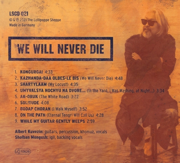 "We Will Never Die" ist eine fesselnde CD-Veröffentlichung der renommierten Band Yat-Kha und erscheint beim Hersteller The Lollipoppe Shoppe. Das Album präsentiert die einzigartige Mischung aus traditionellem tuwinischem Kehlgesang und Elementen aus Rock sowie Weltmusik ? ein unvergessliches Klangerlebnis! Gegründet 1991 unter der Leitung des charismatischen Frontmanns Albert Kuvezin hat sich Yat-Kha weltweit einen Namen gemacht für ihre innovativen Klanglandschaften und kraftvollen Auftritte. Frühere Alben wurden international hochgelobt und machten sie zu Pionieren bei der Verbindung alter Musiktraditionen mit modernen Genres. Der Hersteller The Lollipoppe Shoppe steht für außergewöhnliche Veröffentlichungen verschiedenster Stilrichtungen und unterstützt mit dieser Produktion erneut wegweisende Künstler wie Yat-Kha.
