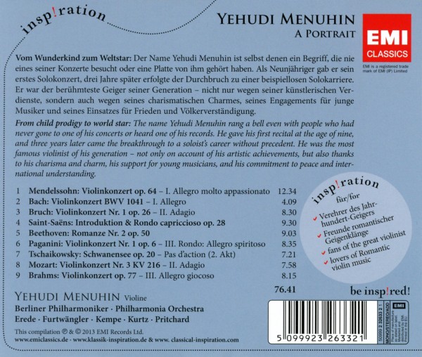 Violin Concerto in E Minor, Op.64 (1999 Digital Remaster): I. Allegro molto appassionato - Cadenza - Tempo I - Presto 01. Berliner Philharmoniker/Wilhelm Furtw?ngler "1. Allegro molto appassionato" Violin Concerto in A Minor, BWV 1041 (1989 Digital Remaster): I. [Allegro] 02. Yehudi Menuhin/Bath Festival Orchestra "1. Allegro" Concerto for Violin and Orchestra No. 1 in G minor, Op. 26 (1959 Remastered Version): II. Adagio 03. Yehudi Menuhin/Philharmonia Orchestra/Walter Susskind "2. Adagio" 04. Philharmonia Orchestra/Sir Eugene Goossens/Yehudi Menuhin "Introduction and Rondo Capriccioso in A Minor, Op.28 (2000 Digital Remaster)" 05. Yehudi Menuhin/Philharmonia Orchestra/Sir John Pritchard "Romances (1992 Digital Remaster): F, Op. 50 (c1798)" Violin Concerto No. 1 in D, Op.6 (1987 - Remaster): III. Rondo (Allegro spiritoso) 06. Yehudi Menuhin/Royal Philharmonic Orchestra/Alberto Erede "3. Rondo: Allegro spiritoso" Swan Lake, Op.20 (1990 Digital Remaster), No.13 Danses des cygnes, Nos. 1, 2 & 4 (Act II): Danses des cygnes, No.5 (Act 07. Yehudi Menuhin/Efrem Kurtz/Philharmonia Orchestra "Pas d'action (2. Akt)" Violin Concerto No. 3 in G, K.216 (cadenzas by Franko) (1990 Digital Remaster): II. Adagio (cadenza by Franko) 08. Yehudi Menuhin/Bath Festival Orchestra "2. Adagio" Violin Concerto in D, Op.77 (1988 Digital Remaster): III. Allegro giocoso, ma non troppo vivace 09. Yehudi Menuhin/Rudolf Kempe "3. Allegro giocoso, ma non troppo vivace - Poco pi? presto"