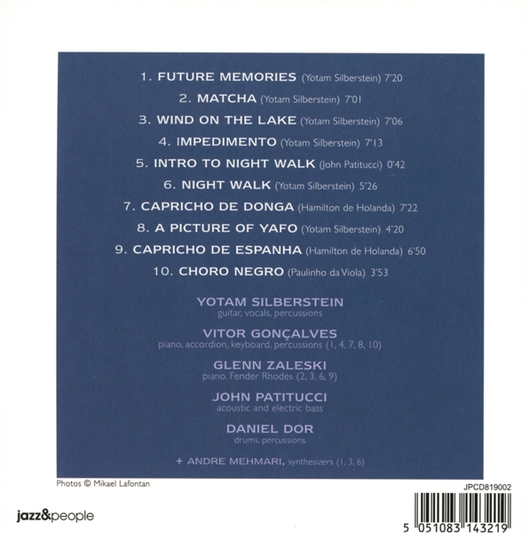 01. Silberstein, Yotam / Patitucci, John / Dor, Daniel / Goncalves, Vitor "Future memories" 02. Silberstein, Yotam / Patitucci, John / Dor, Daniel / Zaleski, Glenn "Matcha" 03. Silberstein, Yotam / Patitucci, John / Dor, Daniel / Zaleski, Glenn "Wind on the lake" 04. Silberstein, Yotam / Patitucci, John / Dor, Daniel / Goncalves, Vitor "Impedimento" 05. Silberstein, Yotam / Patitucci, John / Dor, Daniel "Intro to night walk" 06. Silberstein, Yotam / Patitucci, John / Dor, Daniel / Zaleski, Glenn "Night walk" 07. Silberstein, Yotam / Patitucci, John / Dor, Daniel / Goncalves, Vitor "Capricho de donga" 08. Silberstein, Yotam / Patitucci, John / Dor, Daniel / Goncalves, Vitor "A picture of Yafo" 09. Silberstein, Yotam / Patitucci, John / Dor, Daniel / Zaleski, Glenn "Capricho de Espanha" 10. Silberstein, Yotam / Patitucci, John / Dor, Daniel / Goncalves, Vitor "Choro negro"