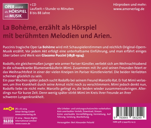 La Boh?me (Oper in 4 Akten) (Auszug) 01. Czecho-Slovak Radio Sypmphony Orchestra "Questo mar rosso" 02. Becker, Patrick "Einfürhung mit Luca Zamperoni" La Boh?me (Oper in 4 Akten) (Auszug) 03. Czecho-Slovak Radio Sypmphony Orchestra "Legna! Signari!" 04. Becker, Patrick "Einführung 1. Akt" La Boh?me (Oper in 4 Akten) (Auszug) 05. Czecho-Slovak Radio Sypmphony Orchestra "Che gilda manina" 06. Becker, Patrick "Szene 1: Marcello, Benoit, Rodolfo, Schaunard - Wer klopft?" 07. Becker, Patrick "Szene 2: Rodolfo, Mimi - Wer ist denn da?" La Boh?me (Oper in 4 Akten) (Auszug) 08. Czecho-Slovak Radio Sypmphony Orchestra "S. Mi chiamano Mimi" 09. Becker, Patrick "Erz?hler" La Boh?me (Oper in 4 Akten) (Auszug) 10. Czecho-Slovak Radio Sypmphony Orchestra "O soave fanciulla" 11. Becker, Patrick "Einführung 1. Akt" La Boh?me (Oper in 4 Akten) (Auszug) 12. Czecho-Slovak Radio Sypmphony Orchestra "Aranci, ninnoli!" 13. Becker, Patrick "Szene 3: Mimi, Rodolfo, Schaunard, Marcello - Rodolfo, Marcello" La Boh?me (Oper in 4 Akten) (Auszug) 14. Czecho-Slovak Radio Sypmphony Orchestra "Quando me'n vo'" 15. Becker, Patrick "Erz?hler" La Boh?me (Oper in 4 Akten) (Auszug) 16. Czecho-Slovak Radio Sypmphony Orchestra "Ahi! - Che c'e?" La Boh?me (Oper in 4 Akten) (Auszug) 17. Czecho-Slovak Radio Sypmphony Orchestra "Caro! Fuori il danaro!" 18. Becker, Patrick "Einführung 3. Akt" La Boh?me (Oper in 4 Akten) (Auszug) 19. Czecho-Slovak Radio Sypmphony Orchestra "Mimi! - Speravo di trovarvi qui" 20. Becker, Patrick "Szene 5: Marcello, Rodolfo - Marcello h?rt..." La Boh?me (Oper in 4 Akten) (Auszug) 21. Czecho-Slovak Radio Sypmphony Orchestra "Ebbene no, non lo son" 22. Becker, Patrick "Szene 6: Mimi, Marcello, Rodolfo - Mimi, die lauschend..." La Boh?me (Oper in 4 Akten) (Auszug) 23. Czecho-Slovak Radio Sypmphony Orchestra "Sempre tua per la vita" 24. Becker, Patrick "Einführung 4. Akt" La Boh?me (Oper in 4 Akten) (Auszug) 25. Czecho-Slovak Radio Sypmphony Orchestra "O Mimi, tu pi? non torni" 26. Becker, Patrick "Szene 7: Rodolfo, Schaunard, Marcello - Herein..." La Boh?me (Oper in 4 Akten) (Auszug) 27. Czecho-Slovak Radio Sypmphony Orchestra "La danza con musica vocale!" 28. Becker, Patrick "Sznene 8: Mimi, Rodolfo - Genau in dem Moment..." La Boh?me (Oper in 4 Akten) (Auszug) 29. Czecho-Slovak Radio Sypmphony Orchestra "Sono andanti?" 30. Becker, Patrick "Epilog" La Boh?me (Oper in 4 Akten) (Auszug) 31. Czecho-Slovak Radio Sypmphony Orchestra "Come va?"