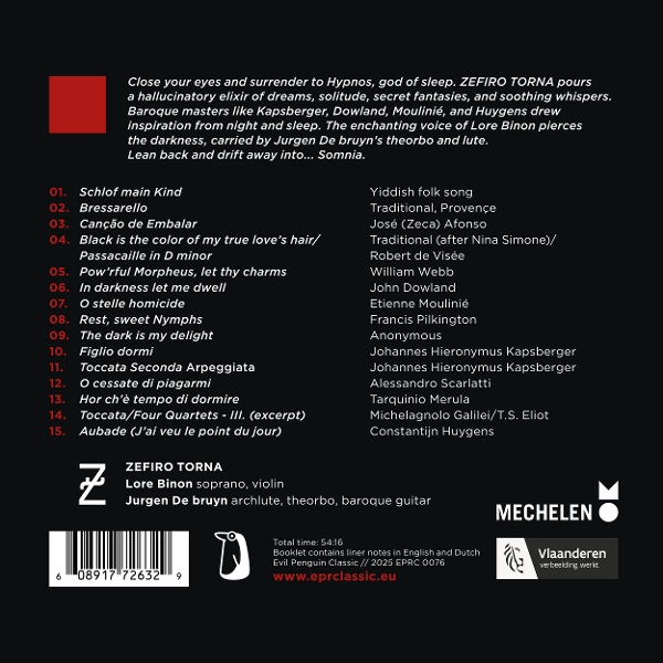 1. SCHLOF MAIN KIND 2. BRESSARELLO 3. CANCAO DE EMBALAR 4. BLACK IS THE COLOR OF MY TRUE LOVE'S HAIR/PASSACAILLE IN D MINOR 5. POW RFUL MORPHEUS, LET THY CHARMS 6. IN DARKNESS LET ME DWELL 7. O STELLE HOMICIDE 8. REST SWEET NYMPHS 9. THE DARK IS MY DELIGHT 10. FIGLIO DORMI 11. TOCCATA SECONDA 'ARPEGGIATA' 12. O CESSATE DI PIAGARMI 13. HOR CH'E TEMPO DI DORMIRE 14. TOCCATA/FOUR QUARTETS - III. (EXCERPT) 15. AUBADE (J'AI VEU LE POINT DU JOUR)