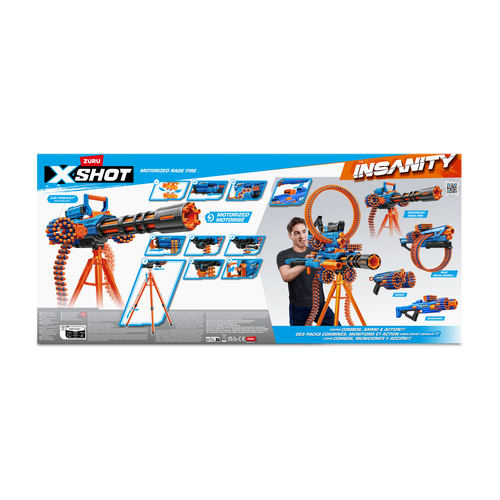 Beschreibung: Unglaubliche Action mit den X-Shot Insanity Blastern! Der motorisierte Rage Fire Blaster ist so groß, dass er mit einem Stativ ausgestattet ist. Lade den automatischen Munitionsgürtel mit 40 Darts auf, um mehrere Ziele aus bis zu 27 m Entfernung in Sekundenschnelle auszuschalten! Er kommt mit einer großen Menge an Zubehör. Die X-Shot Darts besitzen die neue Air-Pocket-Technologie für schnellere und genauere Schüsse auf größere Distanz. Kombiniere den Motorized Rage Fire mit anderen Insanity-Blastern, um den irrsinnigsten Blaster zu schaffen!